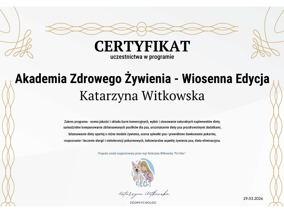 Certyfikat Psi Głos po ukończeniu programu.