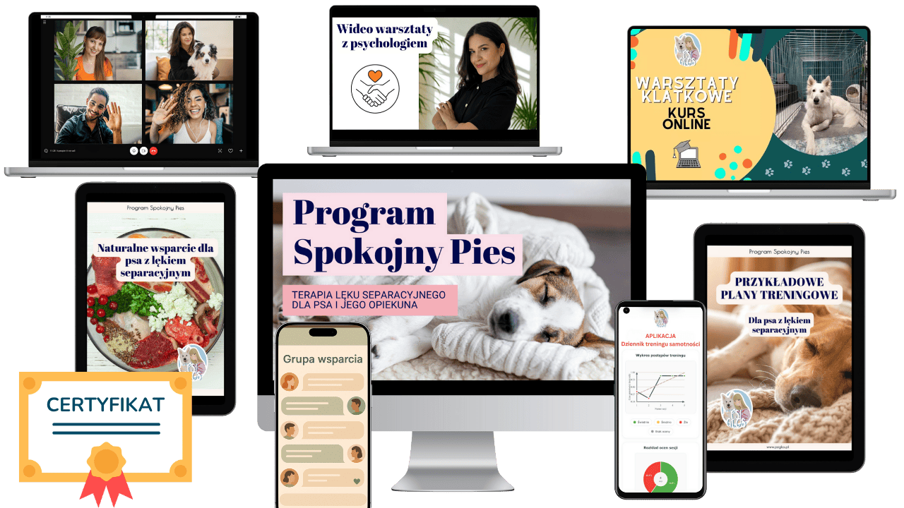 Lęk separacyjny to jedno z najtrudniejszych doświadczeń zarówno dla psa, jak i jego opiekuna. Kurs online „Program Spokojny Pies” pokazuje, jak krok po kroku pomóc psu, który nie potrafi zostać sam, bez presji i bez poczucia winy. To kompleksowa terapia emocji psa i człowieka - od przyczyn, przez praktyczne ćwiczenia, aż po naturalne metody wsparcia. Kurs powstał we współpracy z psychologiem, dzięki czemu wspiera nie tylko psa, ale też opiekuna w tym procesie.